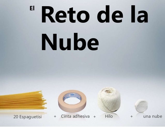 Nos dividimos por grupos con el mismo número de personas (cuatro o cinco personas, más o menos) y nos facilitaron 20 espaguetis, una nube, tijeras, celo y una cuerda con lo que debíamos construir una estructura que se sostuviera por sí sola encima de la mesa y que tuviese en lo más alto la nube de golosina. Los participantes disponíamos de 18 minutos para lograrlo. Cuando se acabó el tiempo, midieron todas las estructuras de cada grupo una cinta métrica, estas debían sostenerse por si solas. El grupo que logró hacerla lo más alta posible fue el ganador.